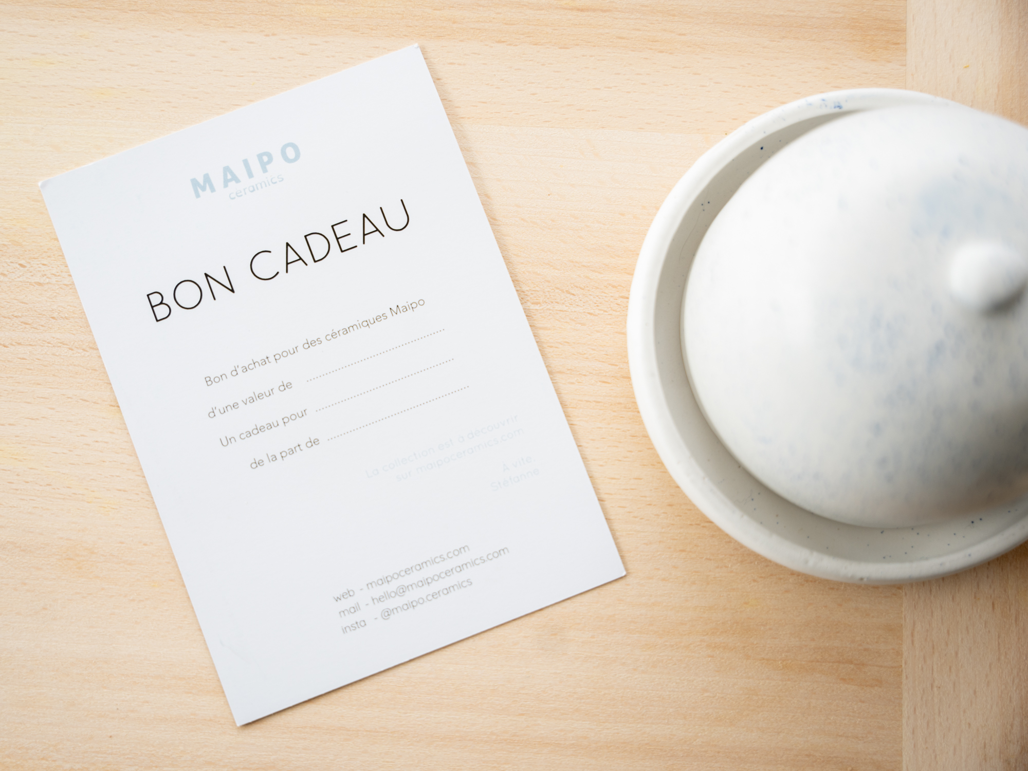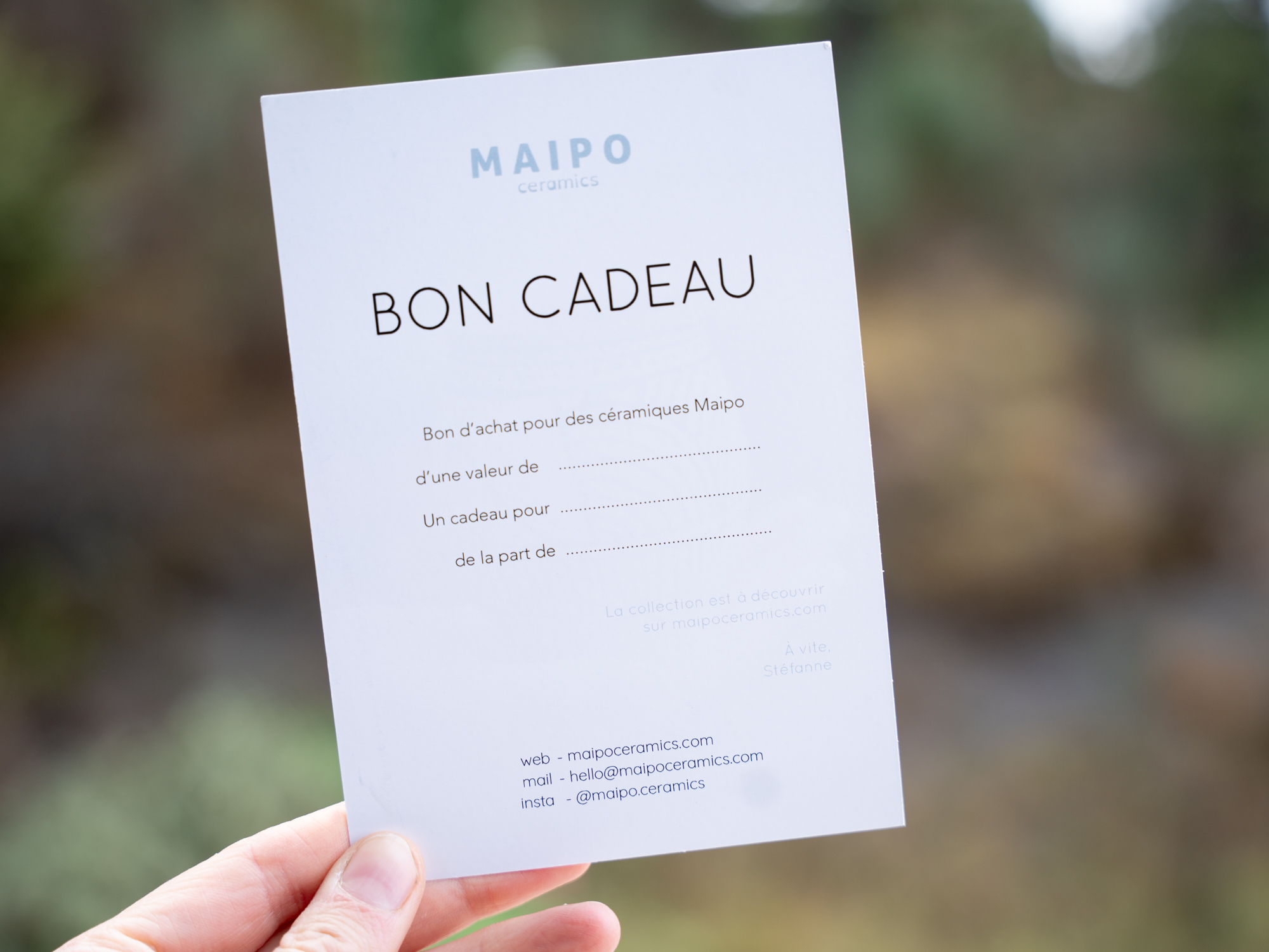 Si vous souhaitez un autre montant, vous pouvez m’envoyez un petit mail à hello@maipoceramics.com et je vous envoie la carte par la poste ou en PDF.