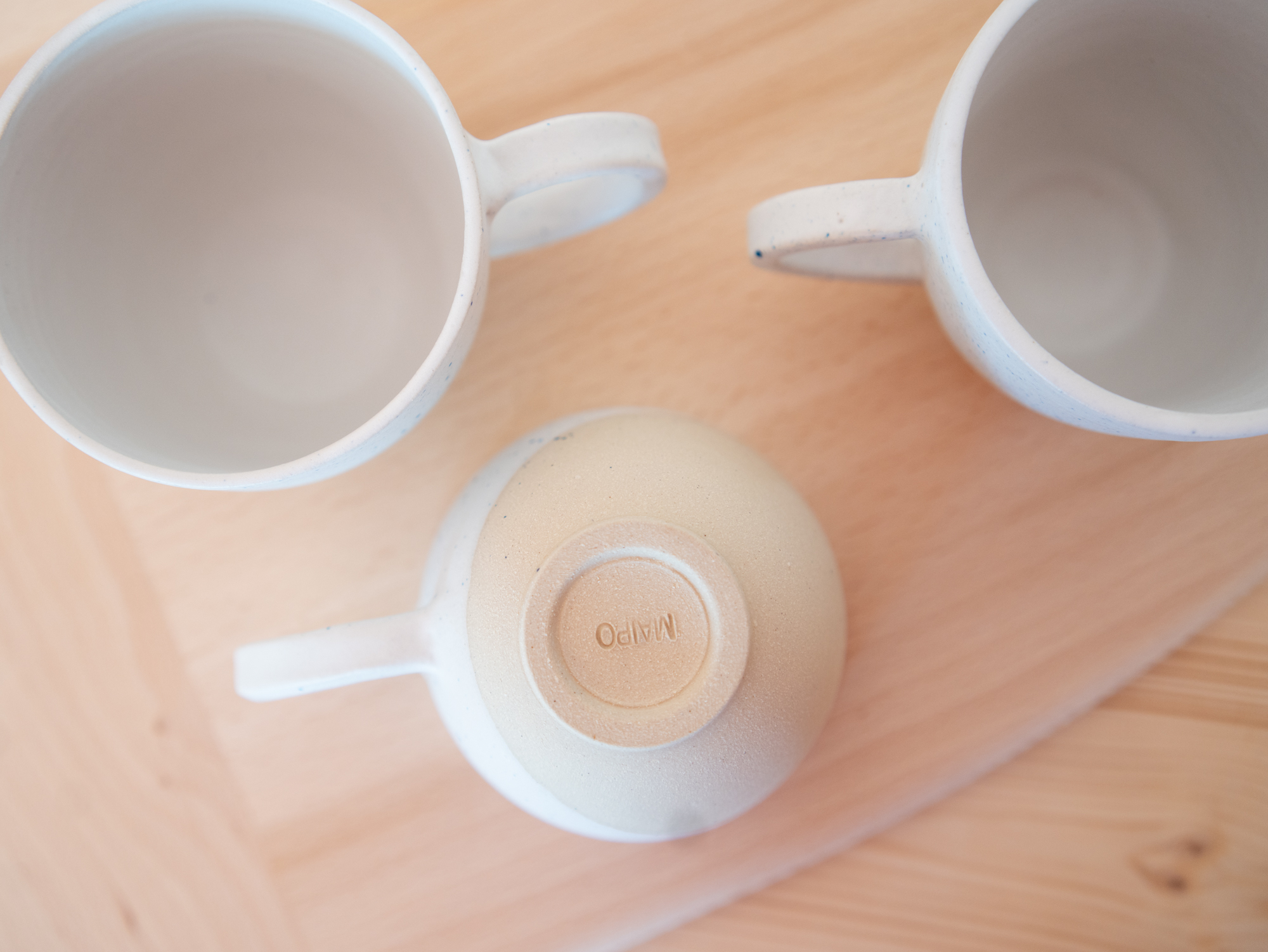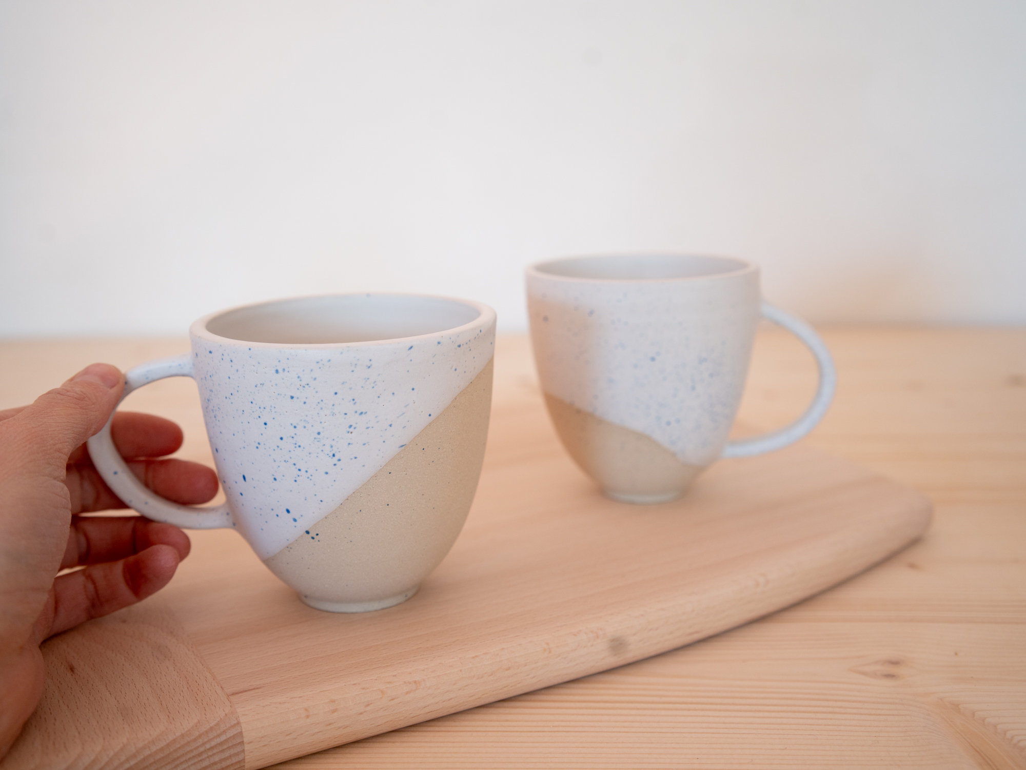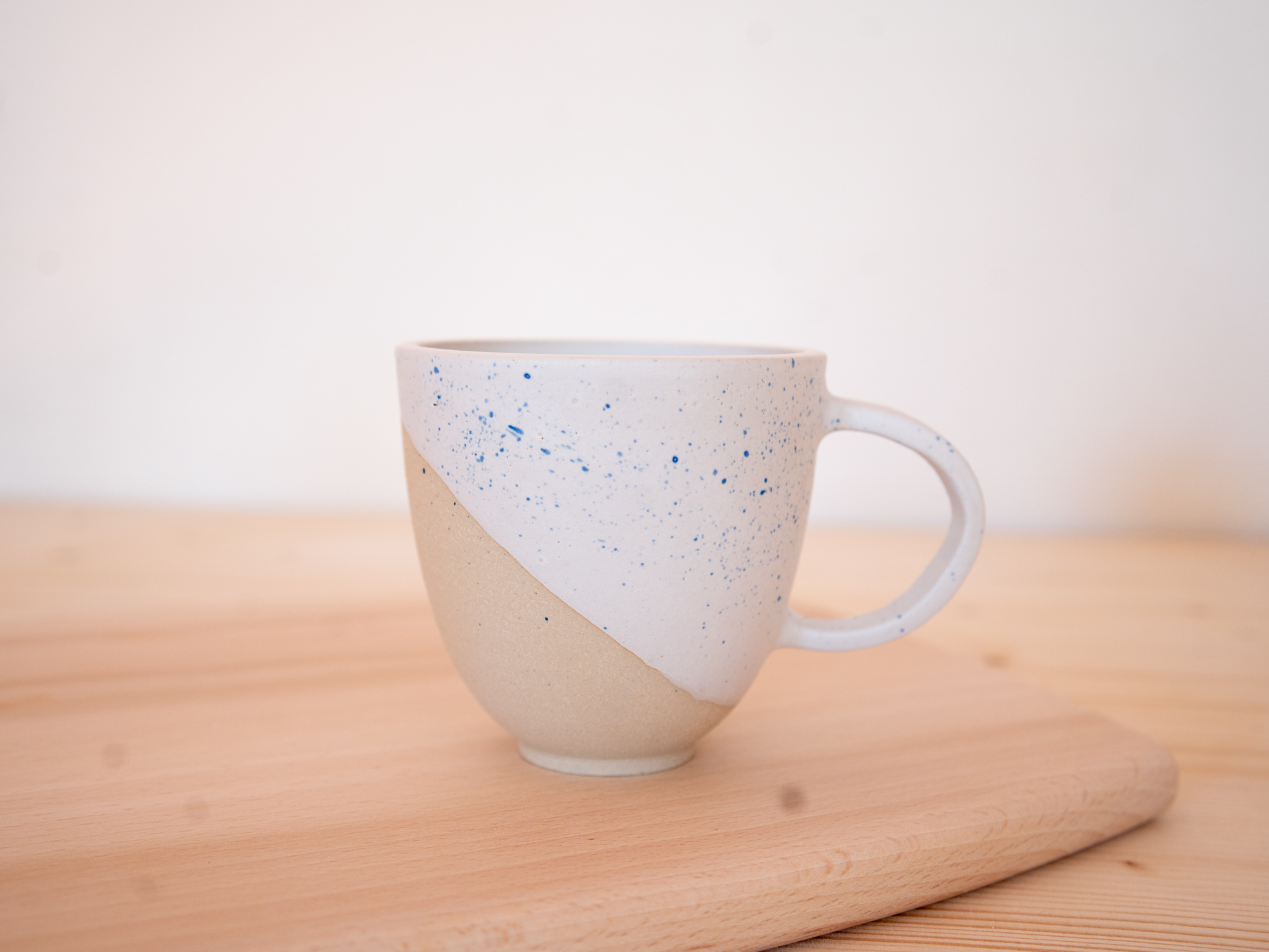 Email blanc mat à l’intérieur et blanc mat moucheté de bleu à l’extérieur