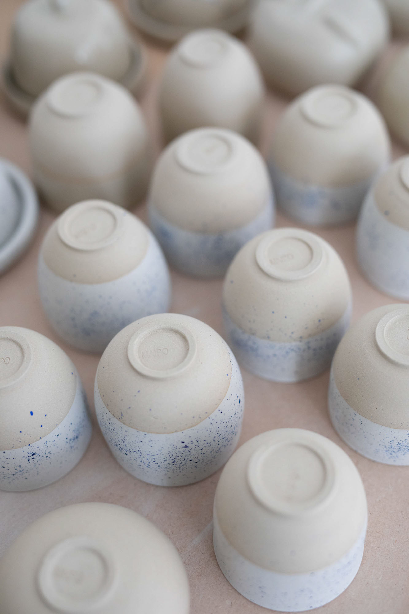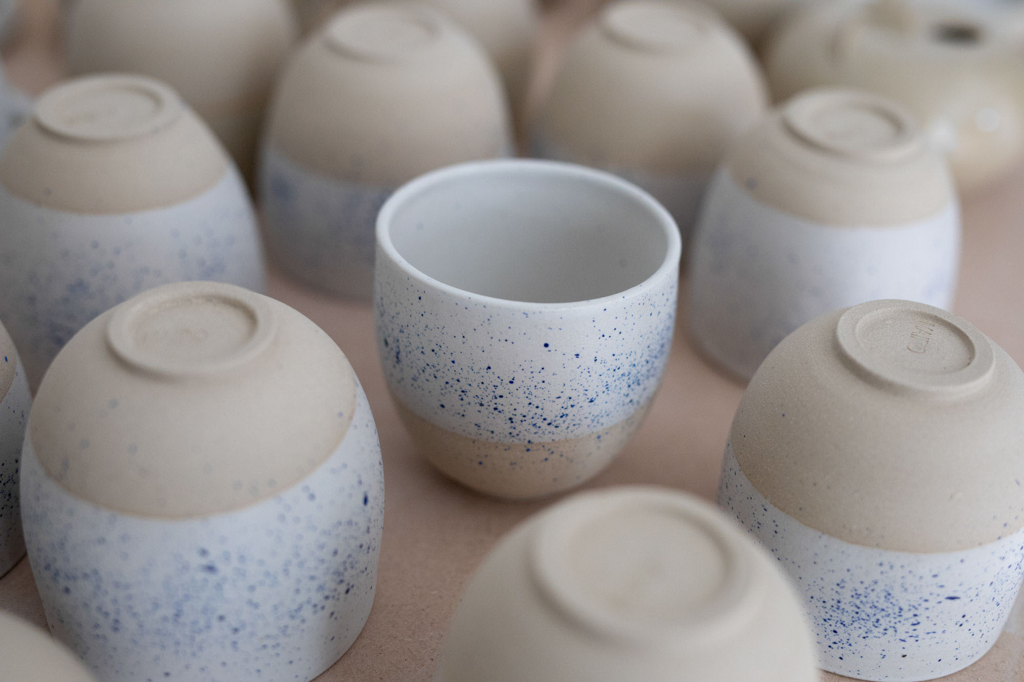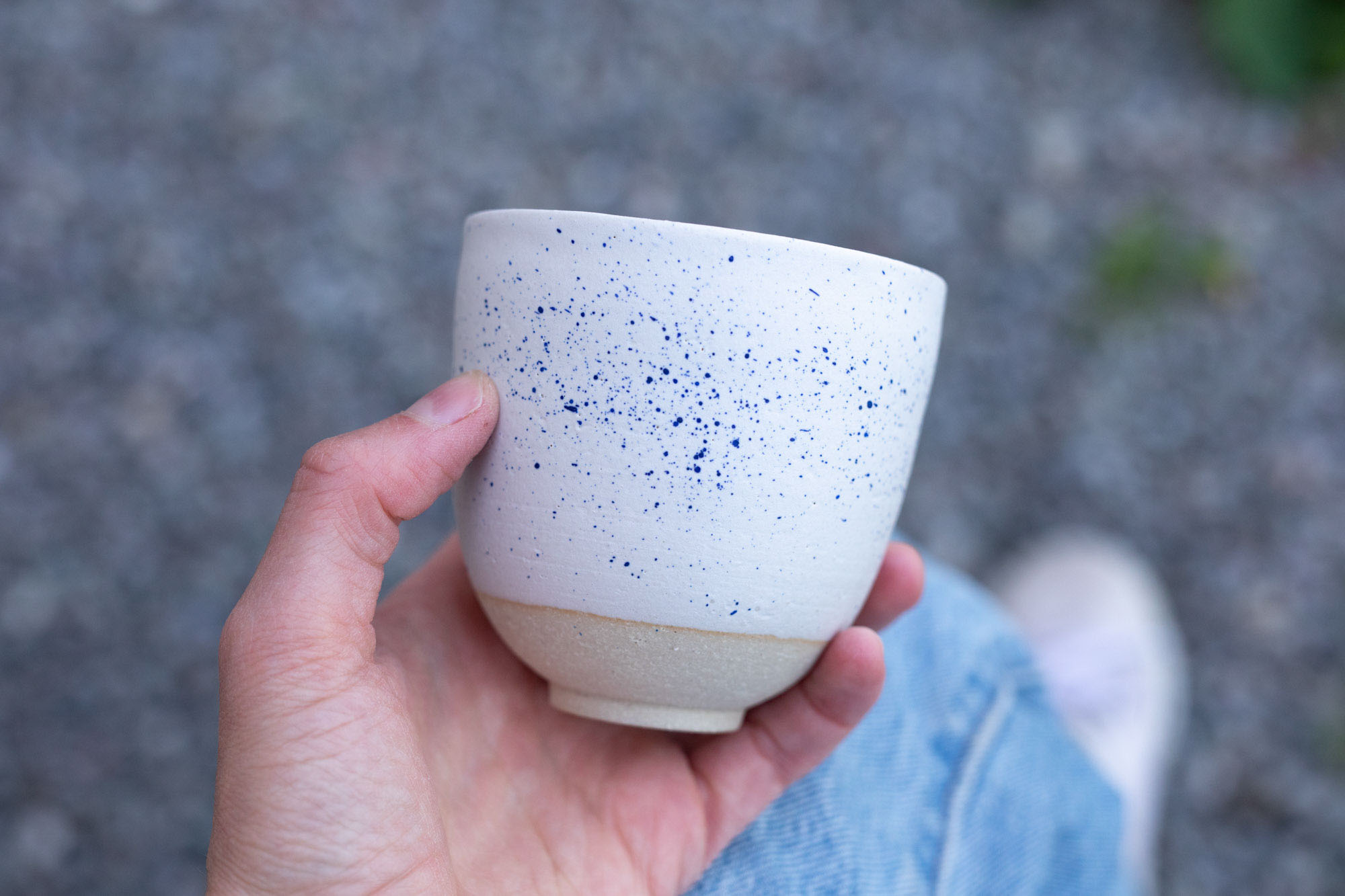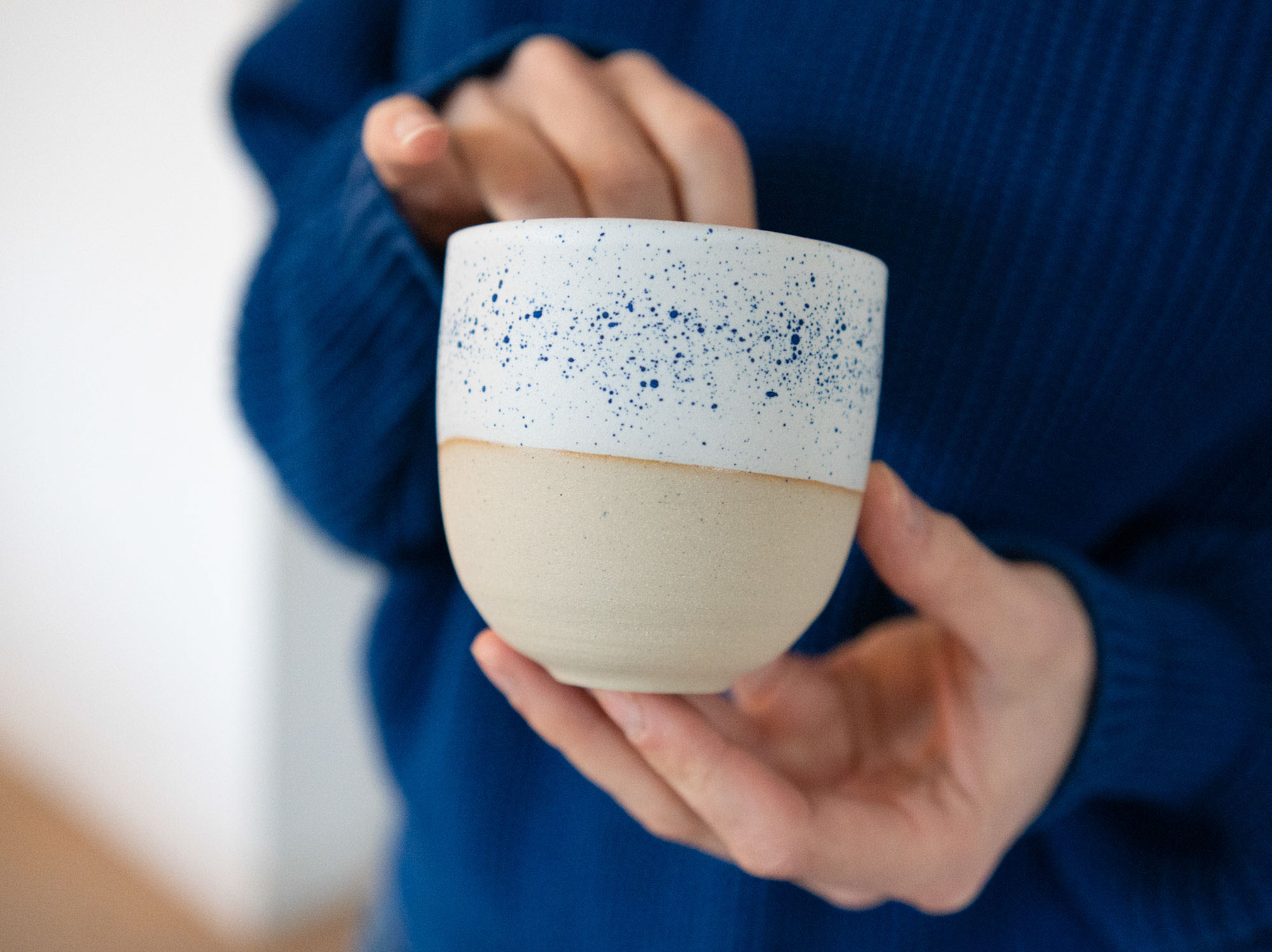 Email blanc mat à l’intérieur et blanc mat moucheté de bleu à l’extérieur